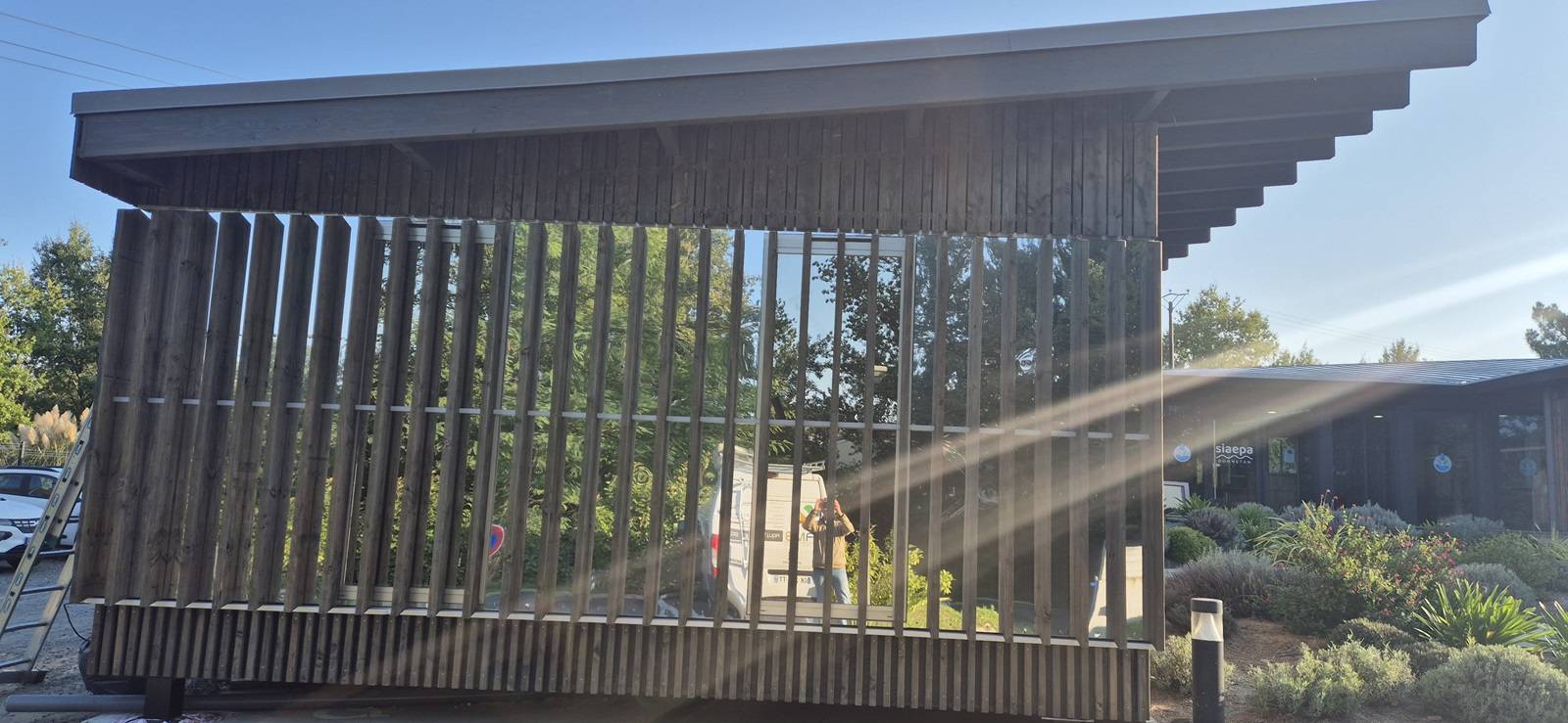 Nous avons opté pour une couverture en zinc et joints debout, un choix esthétique et durable qui s'intègre parfaitement à l'environnement. La façade de ce bâtiment avec bardage à clairevoie en pin douglas lui donne un charme authentique et chaleureux.
